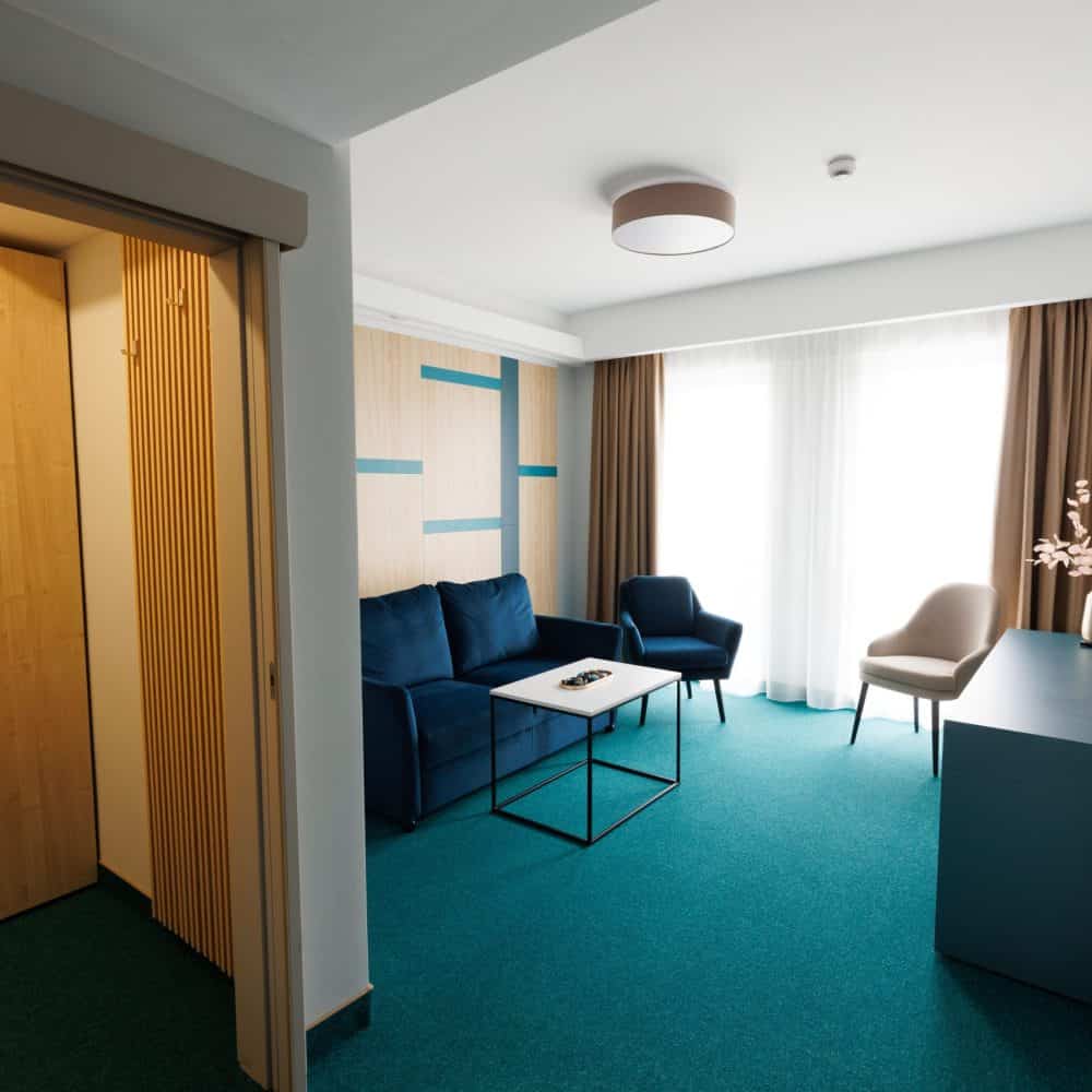 Apartamentele Hotelului YVY sunt spațioase și confortabile, cu o suprafață de aproximativ 40 metri pătrați și sunt compuse dintr-o cameră de zi, un dormitor, hol, baie privată cu cadă și toaletă separată. Toate spațiile sunt amenajate cu mobilier de calitate, decor modern și culori plăcute, care creează o atmosferă primitoare.